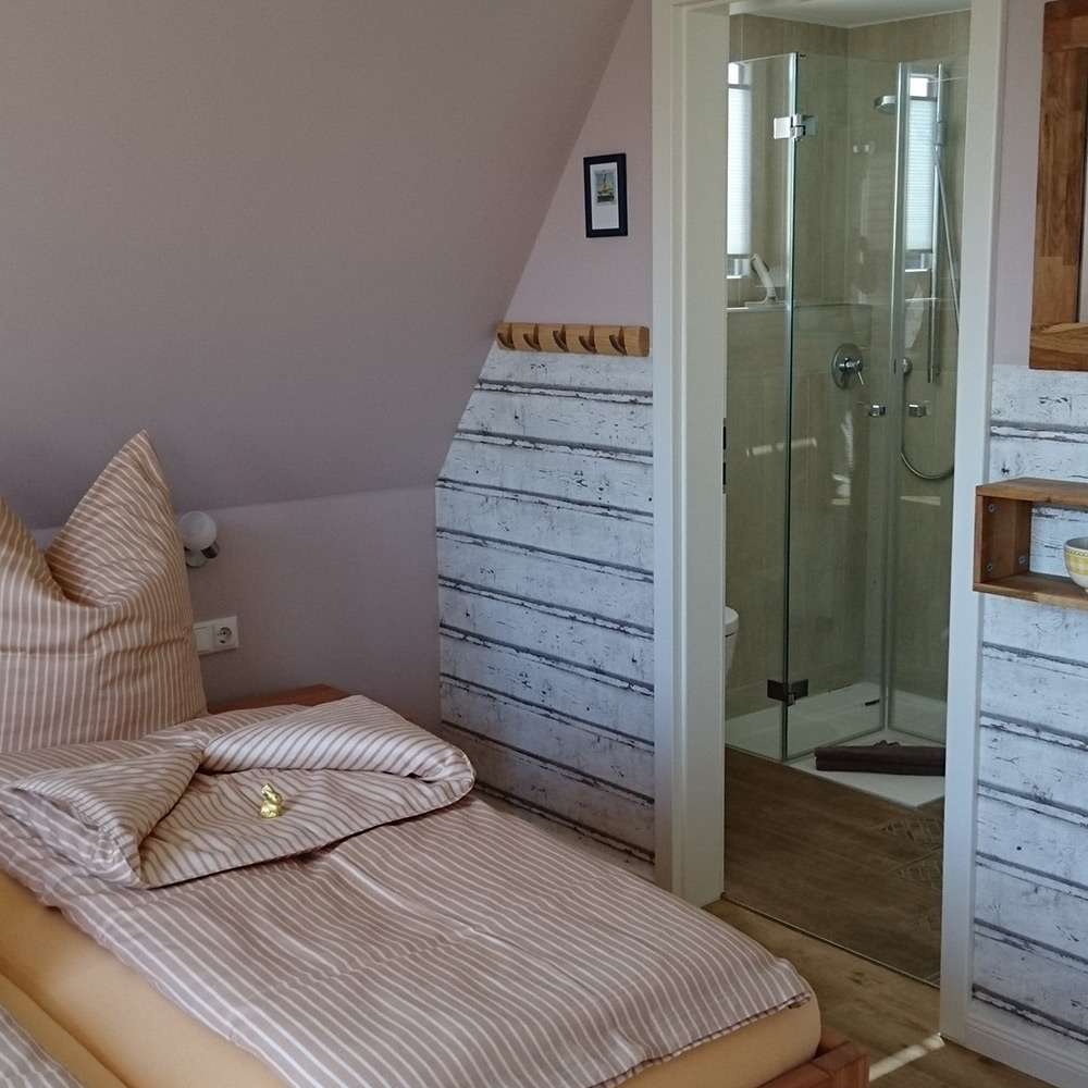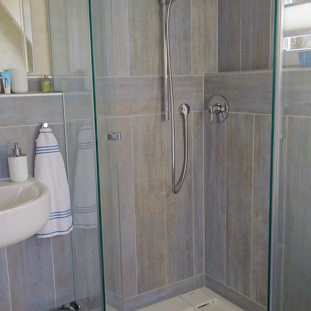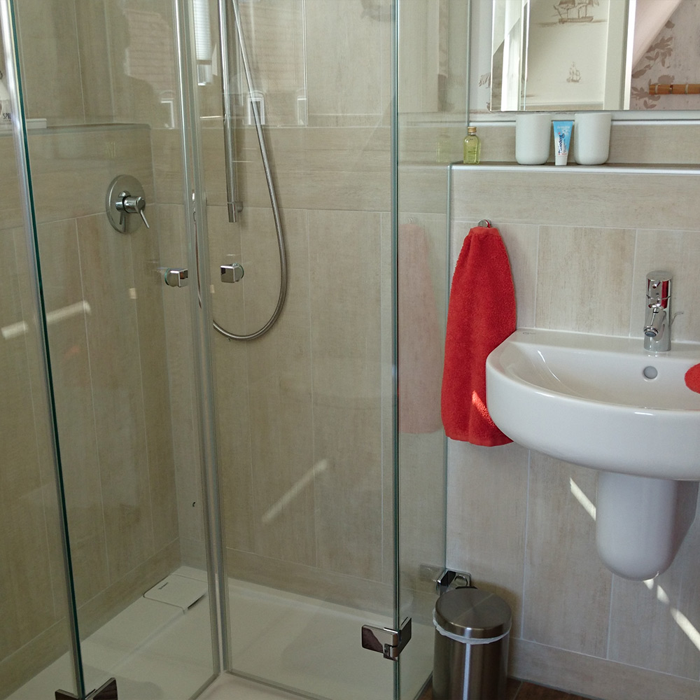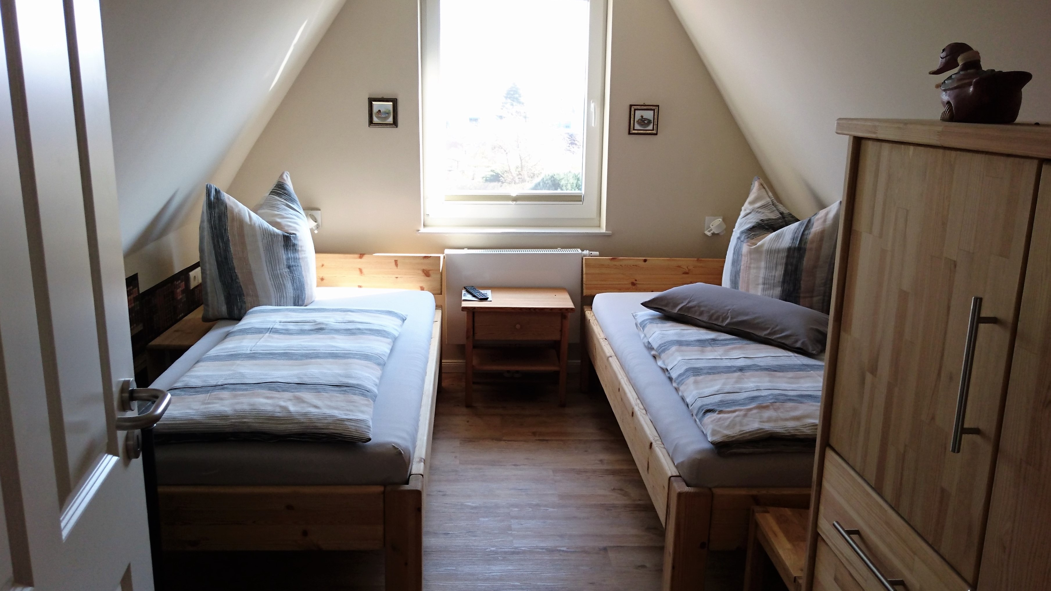 In diesem Geschoss ist der 4te Schlafraum mit 2 Einzelbetten und das 4te Duschbad. Die Ausstattung der Räume ist wie im Obergeschoss.