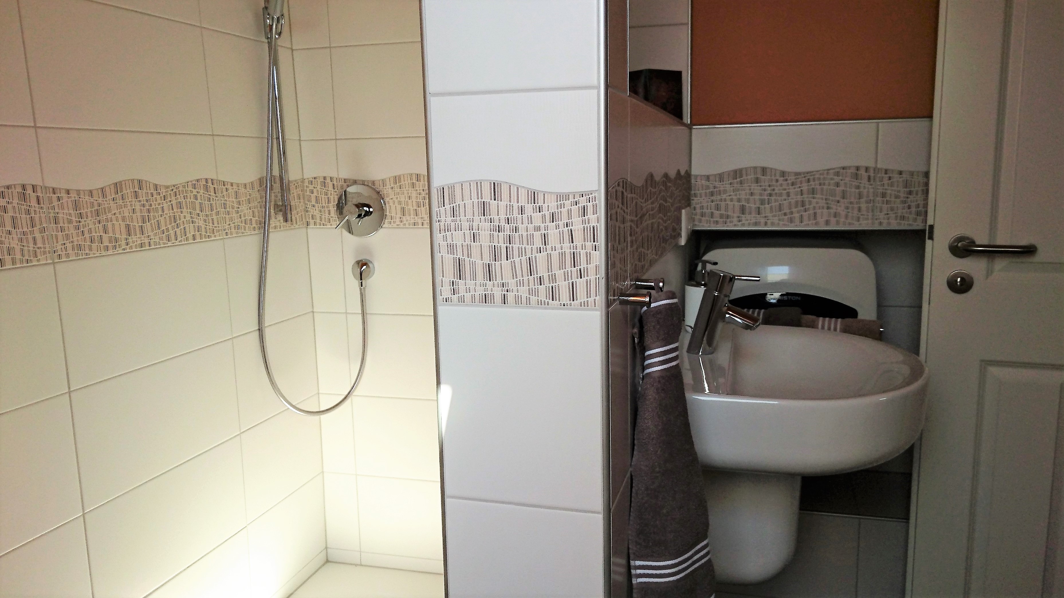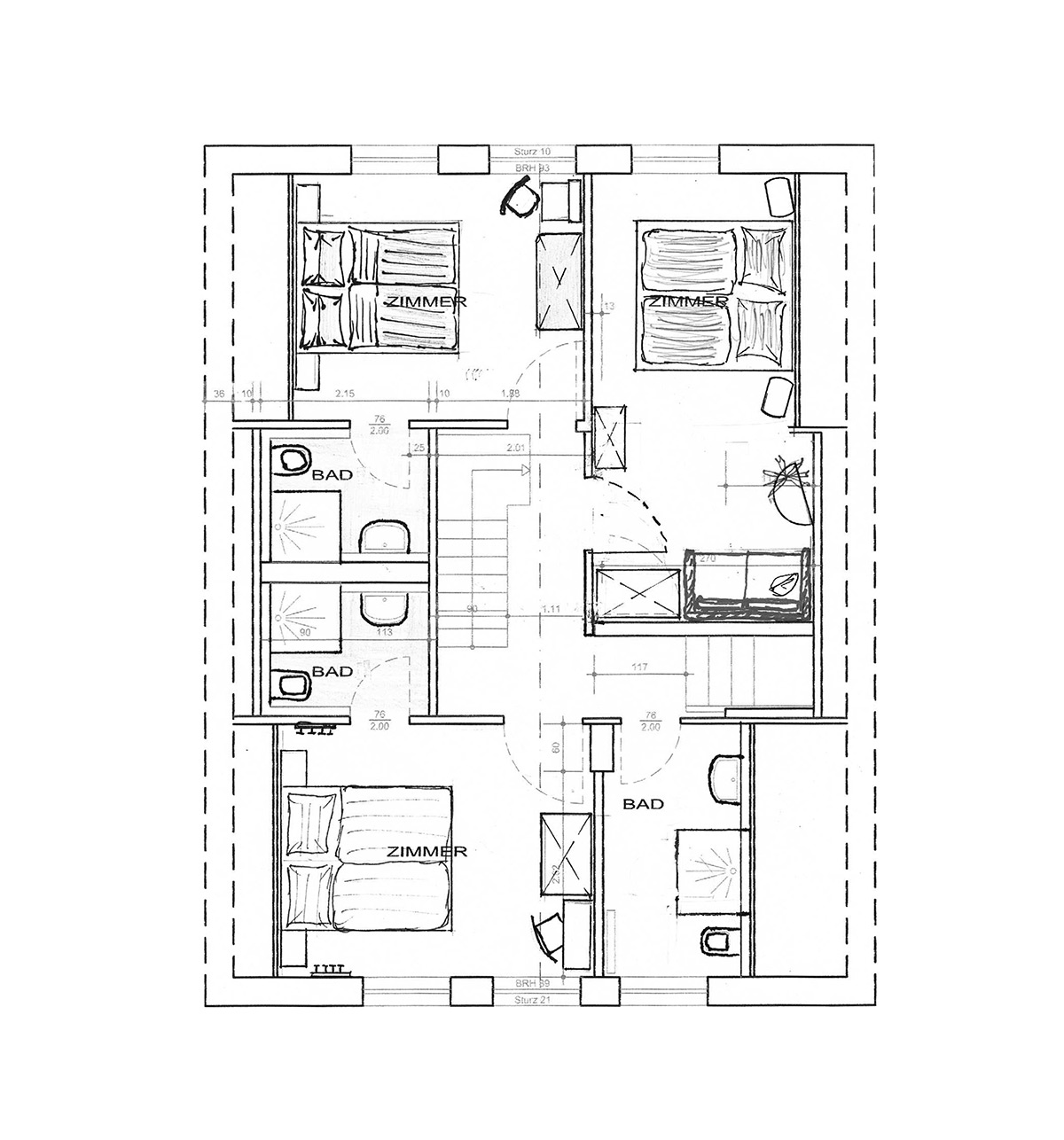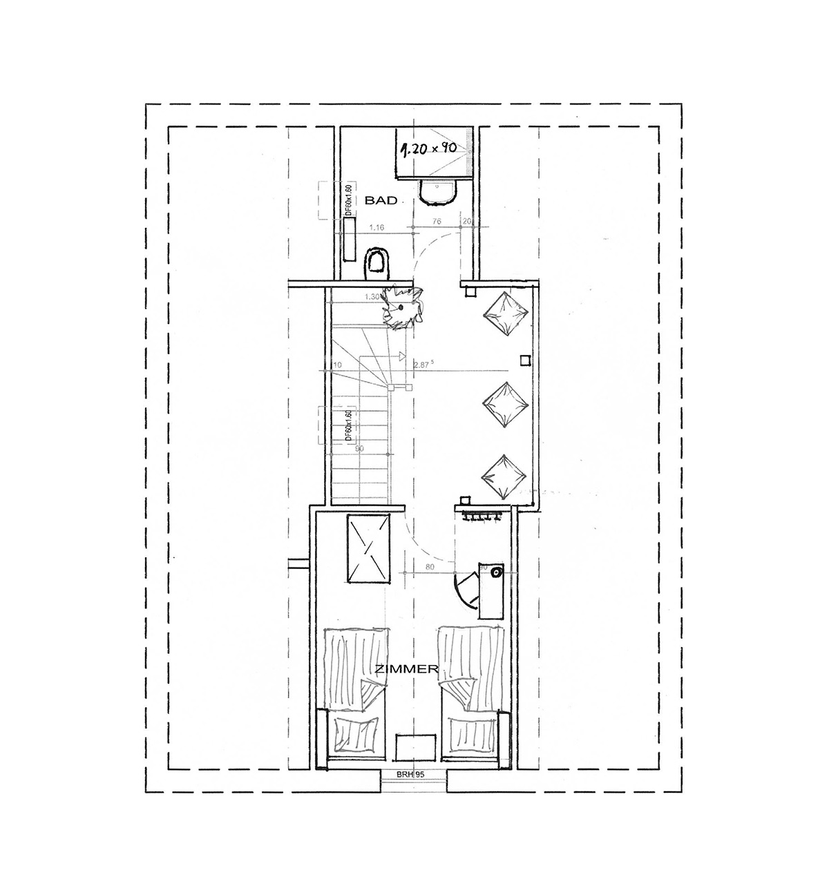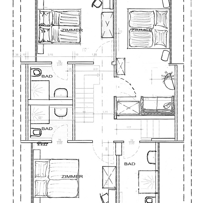 In diesem Geschoss ist der 4te Schlafraum mit 2 Einzelbetten und das 4te Duschbad. Die Ausstattung der Räume ist wie im Obergeschoss.
