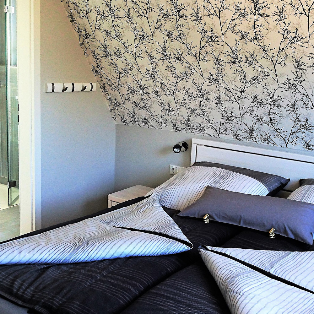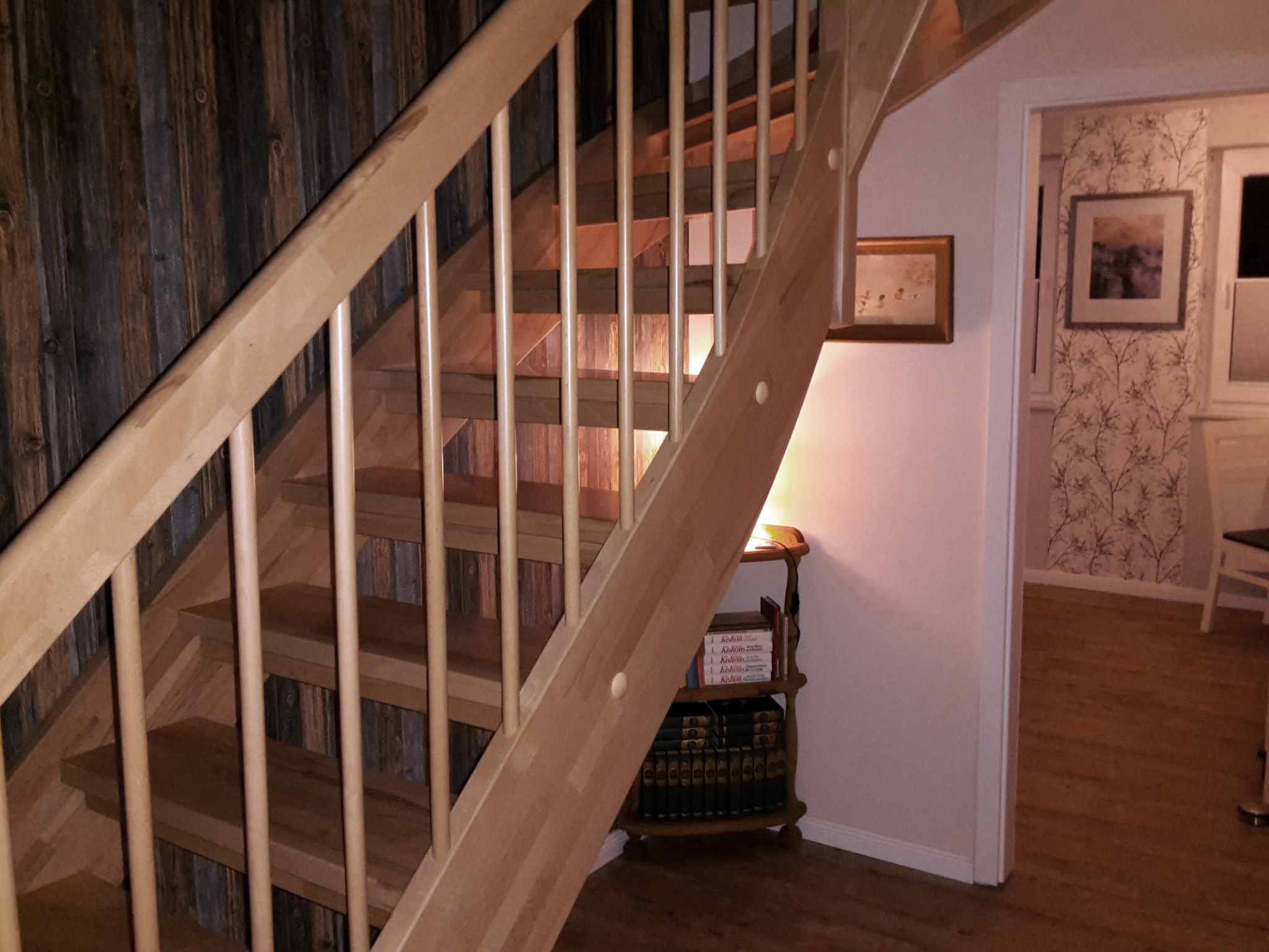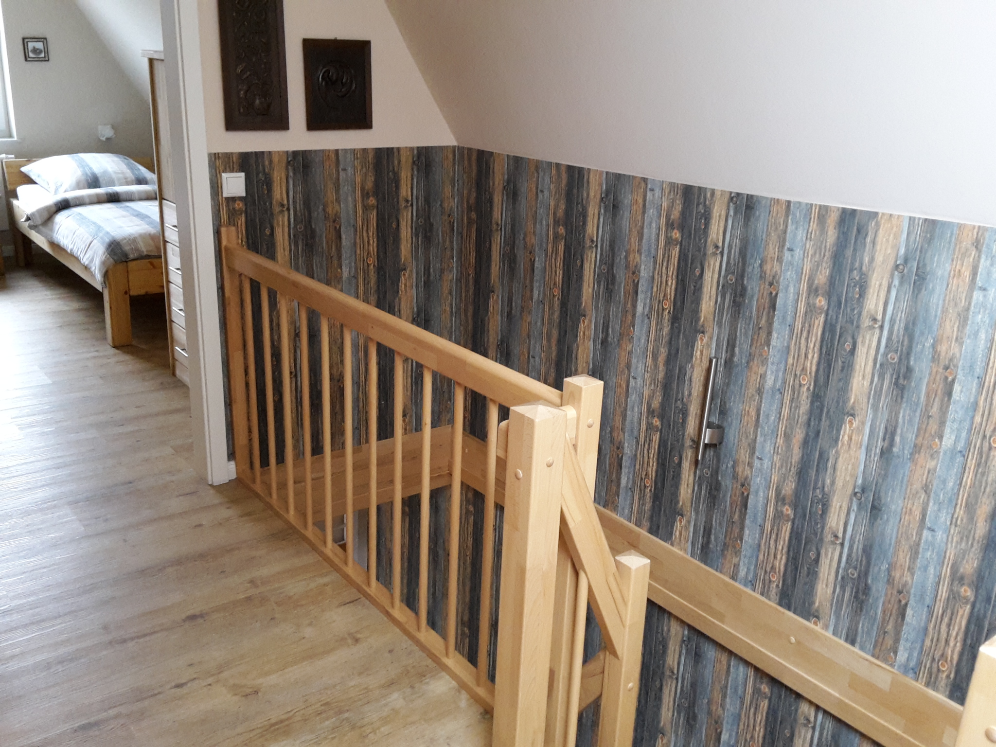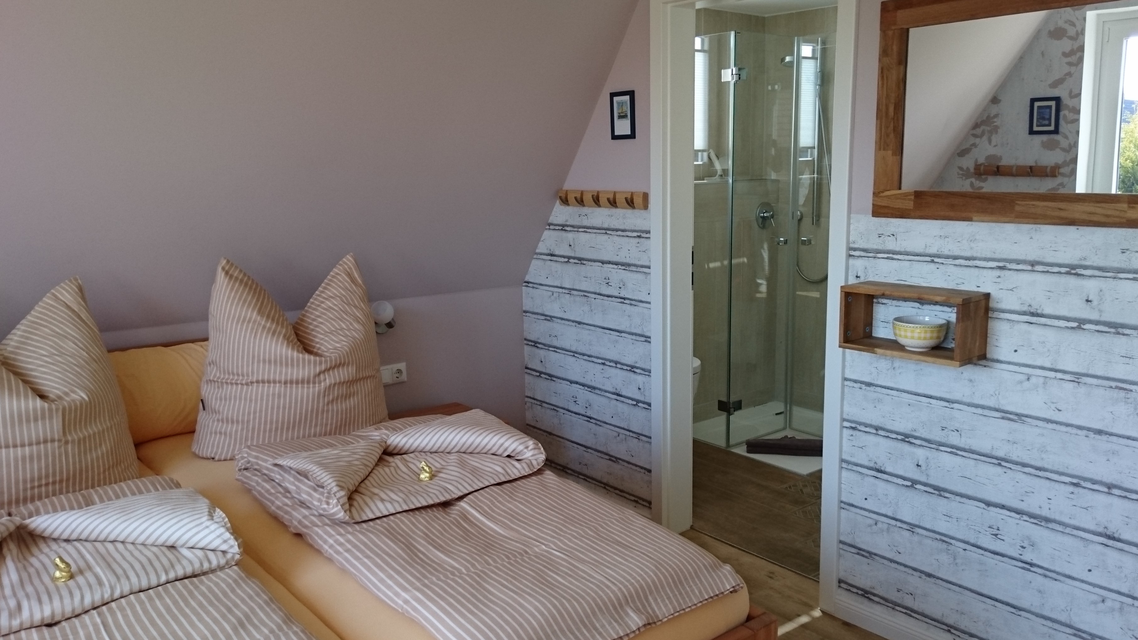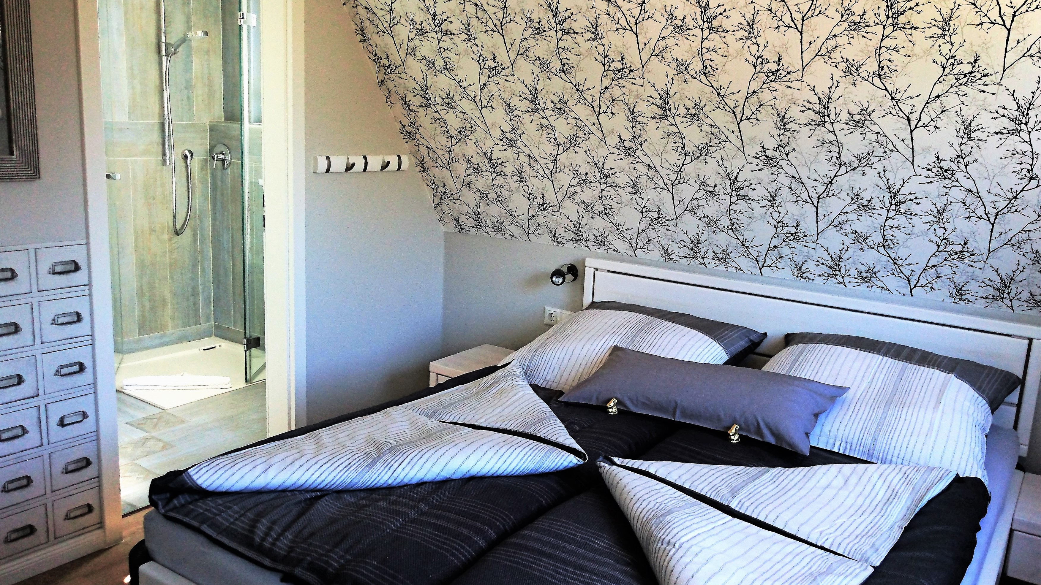Für den Rückzug oder zur Nachtruhe sind im Obergeschoss 3 Schlafräume mit Verdunkelungsplissee und jeweils eigenem Duschbad für Sie vorbereitet. Die Betten sind bezogen, Hand-, Duschtücher, Fön und das erste Verbrauchsmaterial liegen bereit. Jedes Zimmer verfügt über einen Fernseher. In einem Zimmer befindet sich zusätzlich ein Schlafsofa.