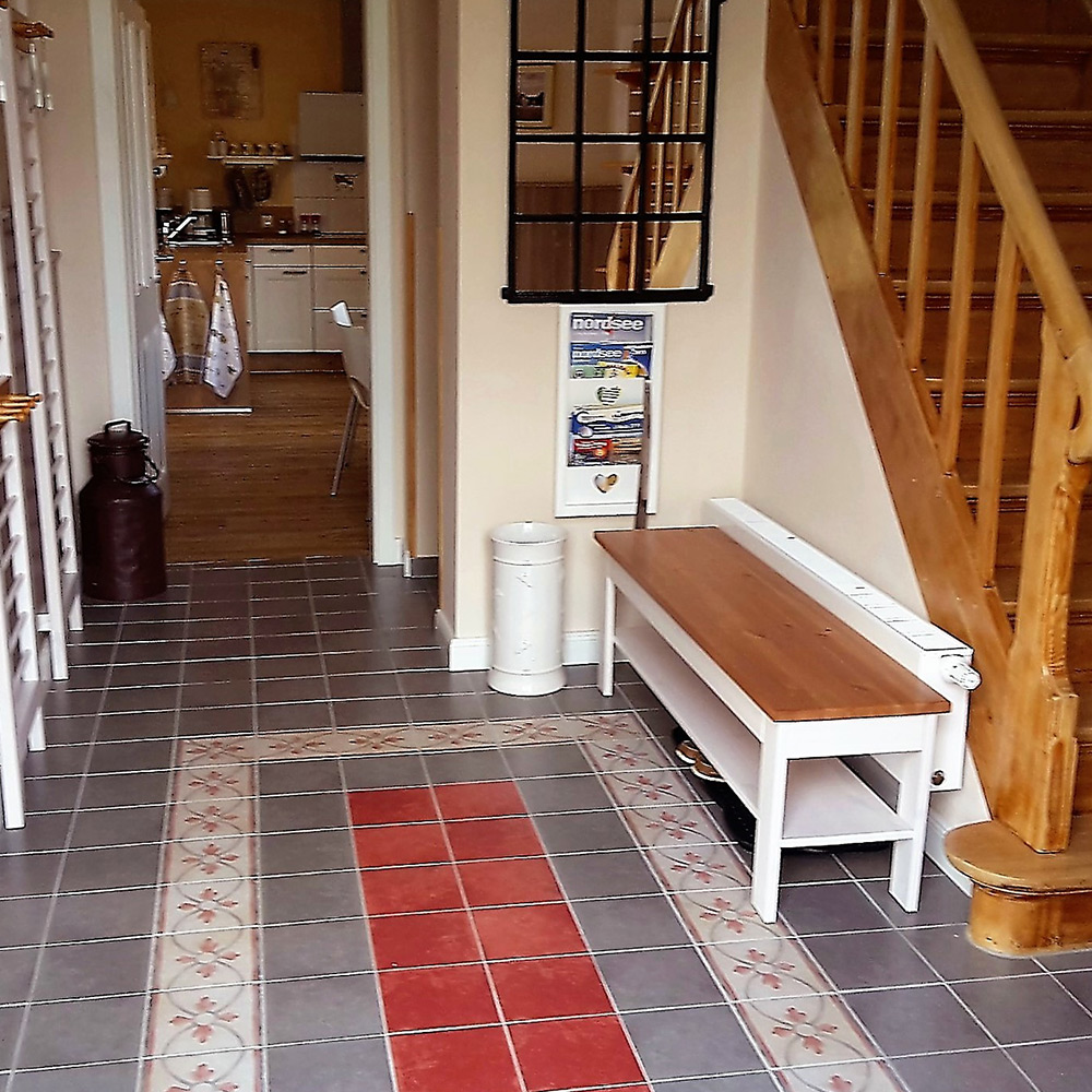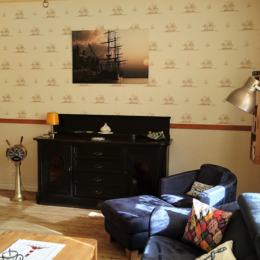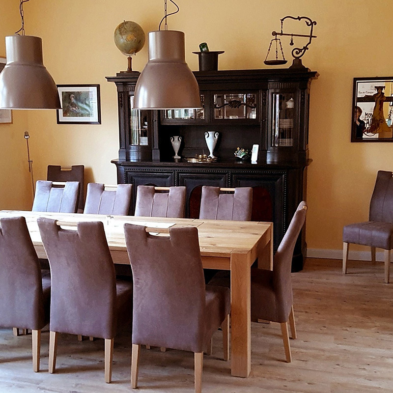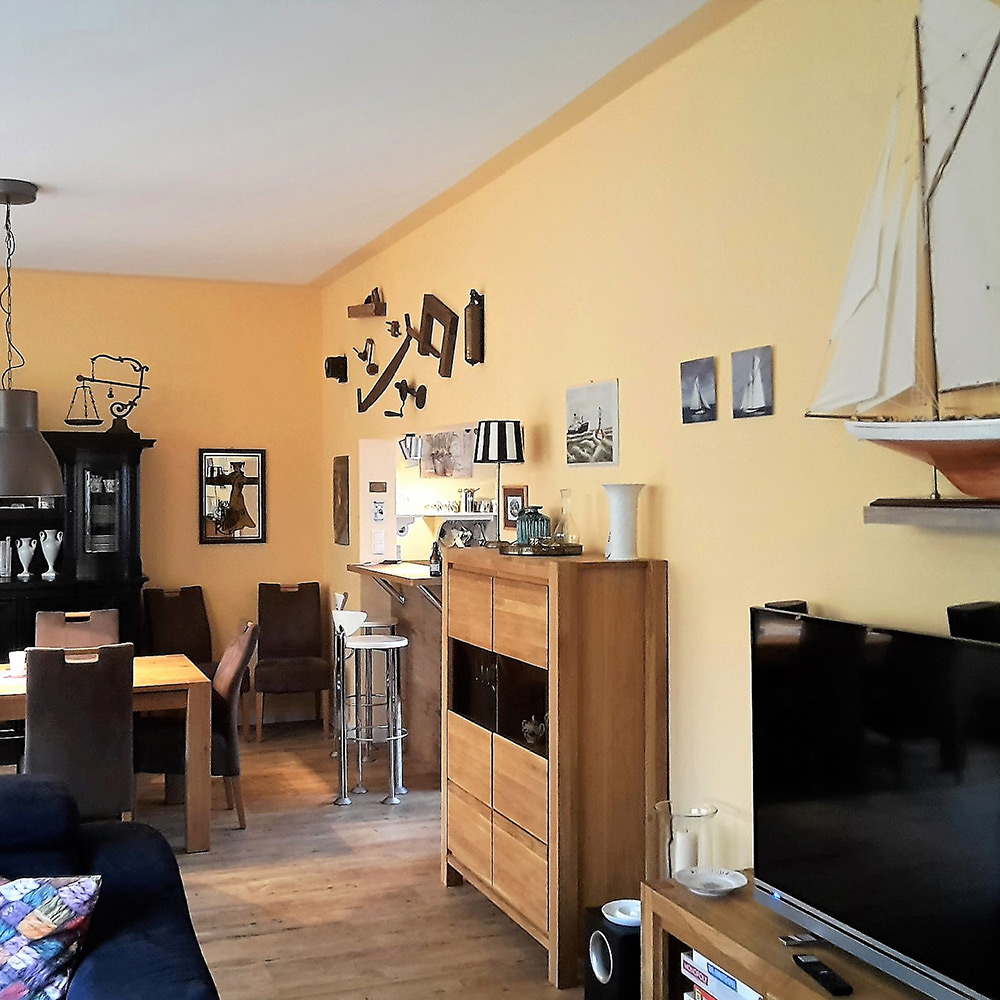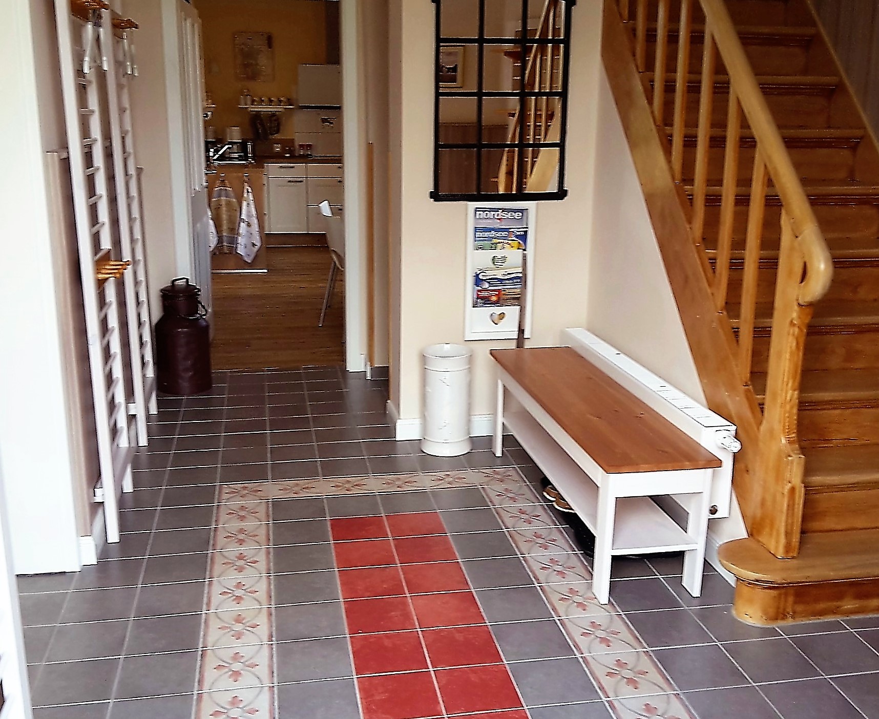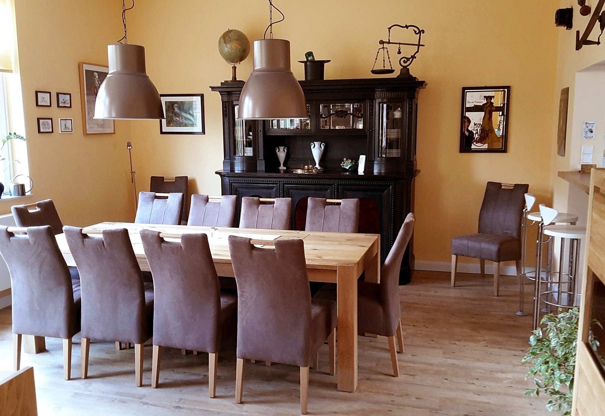 Die Eingangsdiele führt in das großzügige 48 m² Wohn-/Esszimmer. Eine gemütliche Wohnlandschaft, ein Sessel, der große Fernseher, Stereoanlage und CD- und DVD Player stehen zum gemütlichen Beisammensein bereit. Zum gemeinsamen Essen kann der Esstisch für bis zu 12 Personen gedeckt werden. Einige antike Möbel runden die Einrichtung ab. Zur Unterhaltung warten Spiele und Lesestoff auf ihren Einsatz. Auch an kleinere Gäste wurde gedacht.