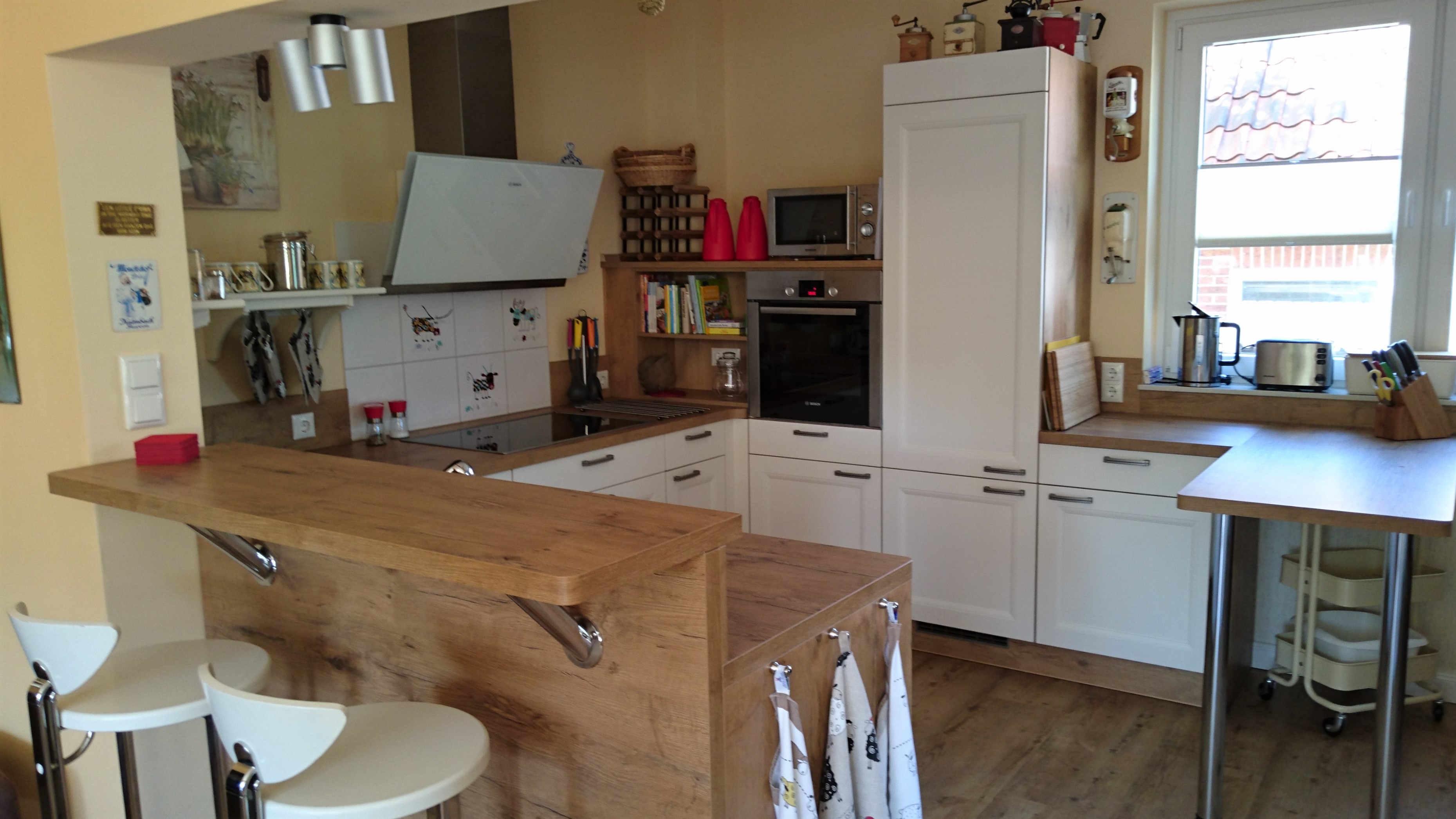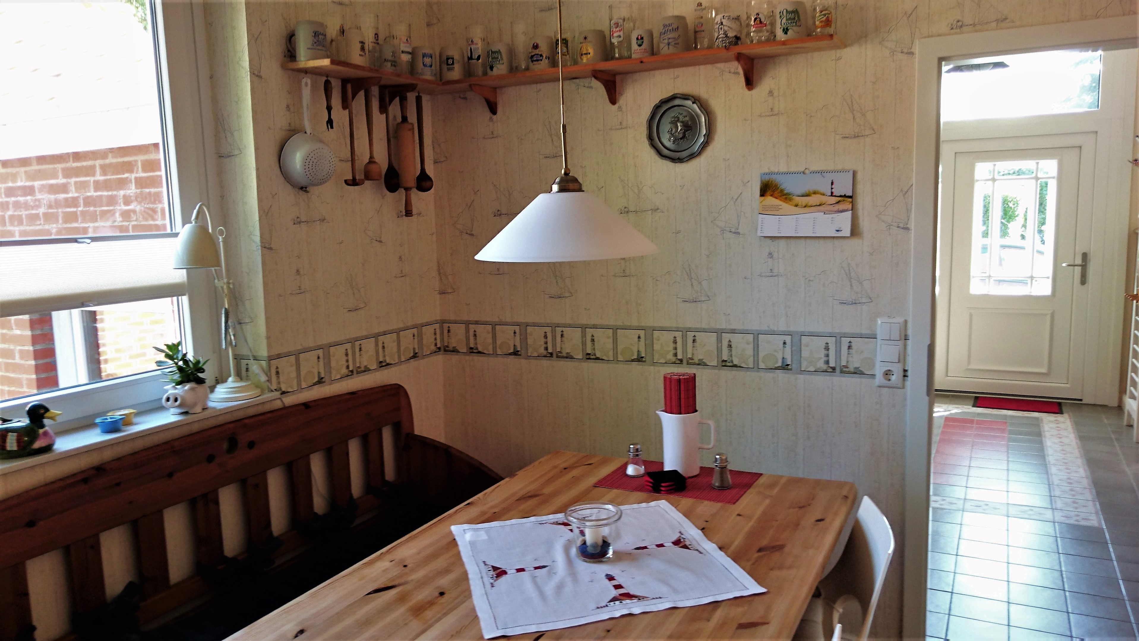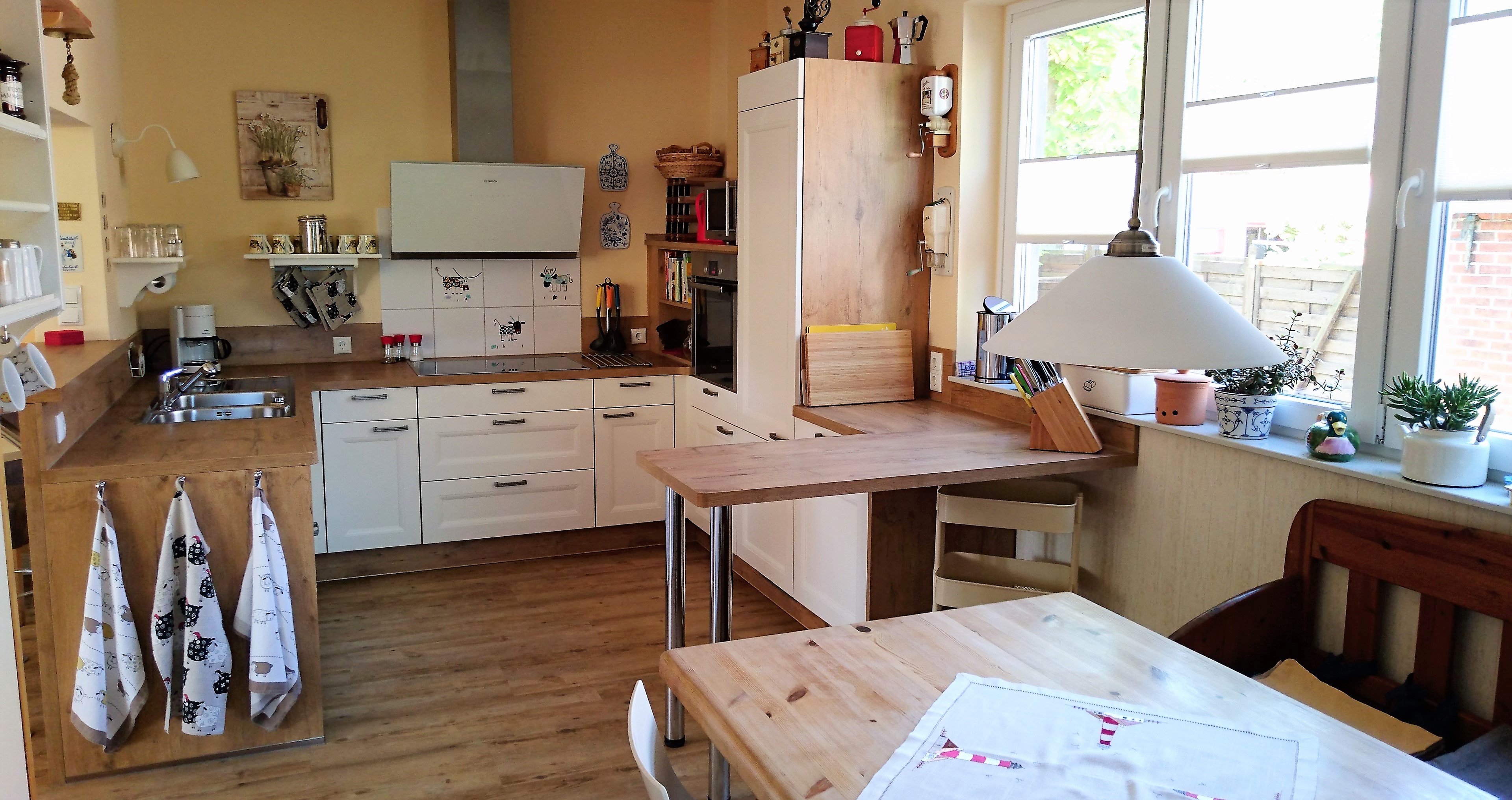 Vom Essplatz und von der Diele aus gelangen Sie in die Küche mit großer Klönecke und Tresen mit Barhocker. Die hochwertige Küchenausstattung, großes Induktionsfeld, XXL-Kühlschrank mit Gefrierfach, XXL-Geschirrspüler, hochgesetzter, selbstreinigender Backofen mit Grill, 2 Kaffeemaschinen, Mikrowelle sowie alle benötigten Kleingeräte, wird die Herzen der Köche erfreuen. Erstes Verbrauchsmaterial wird gestellt. Von der Diele aus gelangen Sie zum WC und zum Hauswirtschaftsraum. Zur Wäschepflege stehen alle Geräte zur Verfügung. Utensilien zur Reinigung im Haus sind vorrätig.