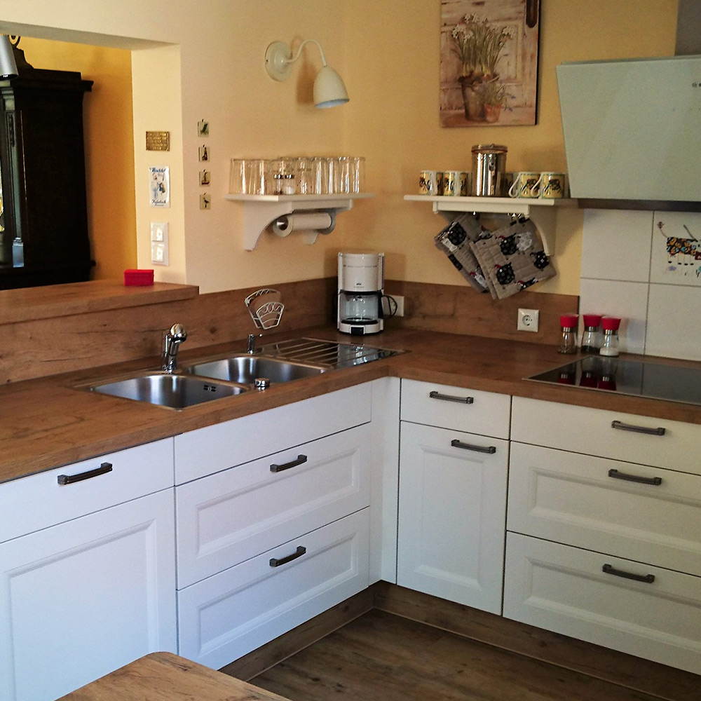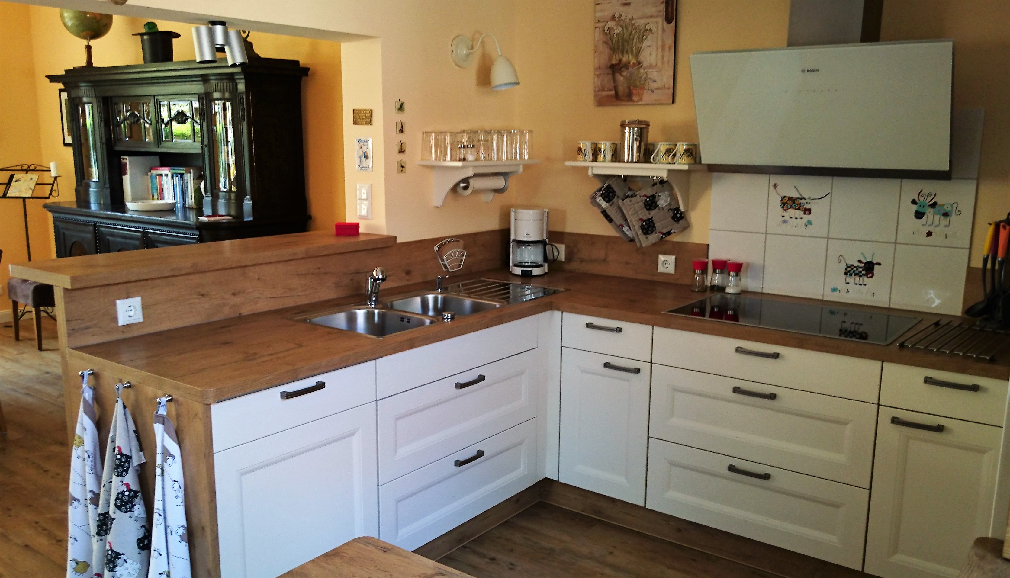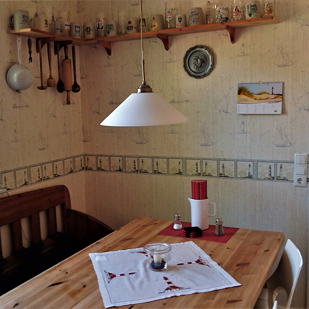 Vom Essplatz und von der Diele aus gelangen Sie in die Küche mit großer Klönecke und Tresen mit Barhocker. Die hochwertige Küchenausstattung, großes Induktionsfeld, XXL-Kühlschrank mit Gefrierfach, XXL-Geschirrspüler, hochgesetzter, selbstreinigender Backofen mit Grill, 2 Kaffeemaschinen, Mikrowelle sowie alle benötigten Kleingeräte, wird die Herzen der Köche erfreuen. Erstes Verbrauchsmaterial wird gestellt. Von der Diele aus gelangen Sie zum WC und zum Hauswirtschaftsraum. Zur Wäschepflege stehen alle Geräte zur Verfügung. Utensilien zur Reinigung im Haus sind vorrätig.